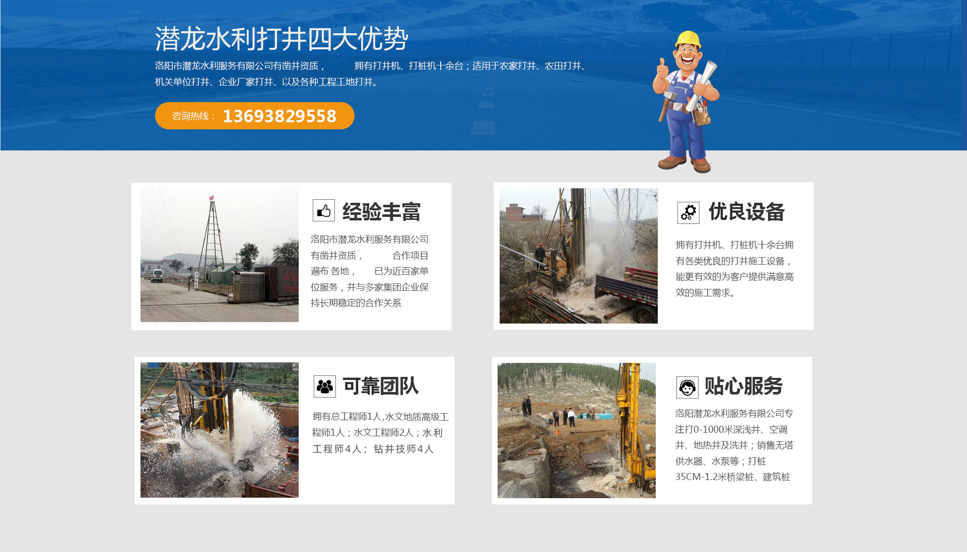 洛陽市潛龍水利服務有限公司成立于2009年,注冊資金200萬元,擁有河南省水井供水技術協會頒發的河南省水井施工單位壹級資質證書,公司擁有打井機、打樁機十余臺;適用于農家打井、農田打井、機關單位打井、企業廠家打井、以及各種工程工地打井。洛陽潛龍水利服務有限公司打0-1000米深淺井、空調井、地熱井及洗井;銷售無塔供水器、水泵等;打樁35CM-1.2米橋梁樁、建筑樁等;代辦洗井業務;農業水利灌溉,土地開發整理項目可行性研究、編制、規劃、設計、預算編制、標書編制、水利技術咨詢服務。